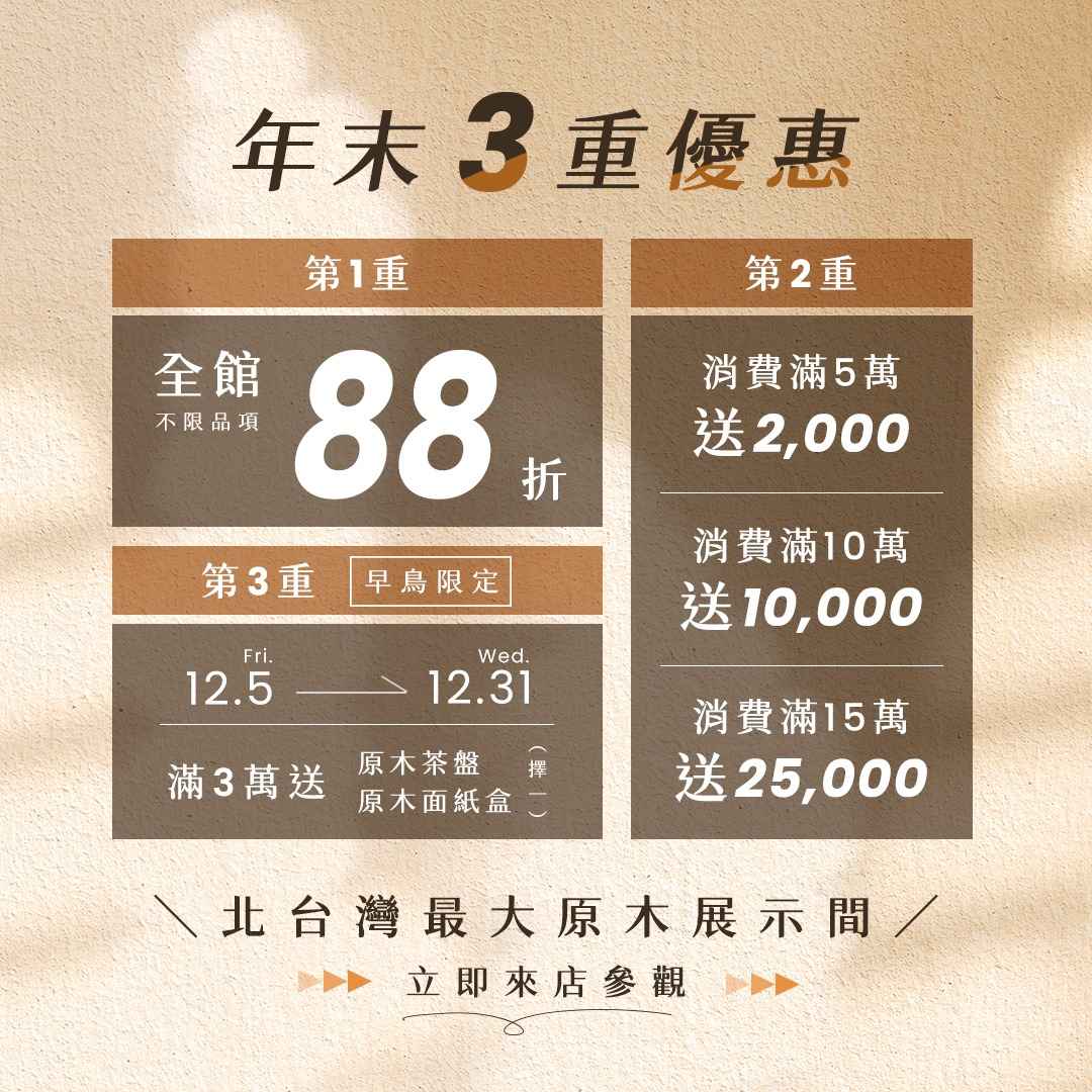 ▌#原木生活.一站逛齊|全館88折,滿額送券想像一下,年末的家裡一張原木桌圍繞著笑聲一張實木床承載甜蜜夢境再添幾張原木椅,讓每頓飯都像團圓盛宴現在正是時候#一站逛齊#全館88折#滿額送券讓原木狂人陪你打造夢想的家—▌#年末三重優惠.溫暖加倍活動時間|2025.12.5 ~ 2026.02.14第1重|全館88折,不限品項第2重|滿額送券,最高送到 25,000,可當次或下次使用第3重|12.5 ~ 12.31,滿 3 萬送原木茶盤或面紙盒(擇一) 原木茶盤和面紙盒情境照?請看「留言區」 原木狂人保有活動解釋、終止與調整之權利